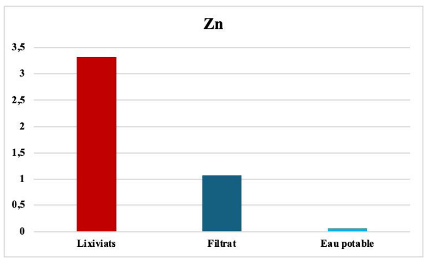 Le zinc avant et après filtration. Le zinc présent dans les lixiviats peut provenir, que ce soit des déchets ménagers, tels que les batteries, les appareils électriques et les produits de soins personnels, des déchets industriels, tels que les déchets de l'industrie chimique, de l'industrie minière et de l'industrie sidérurgique, ou des déchets de construction, comme les déchets de plâtre et de ciment. Le zinc peut être toxique pour les organismes vivants, notamment les poissons et les plantes, et peut s'accumuler dans les organismes vivants et causer des problèmes de santé graves. Il peut contaminer les eaux souterraines et superficielles, ce qui peut affecter la qualité de l'eau et la santé des organismes aquatiques. Le zinc relativement mobile est facilement adsorbé.