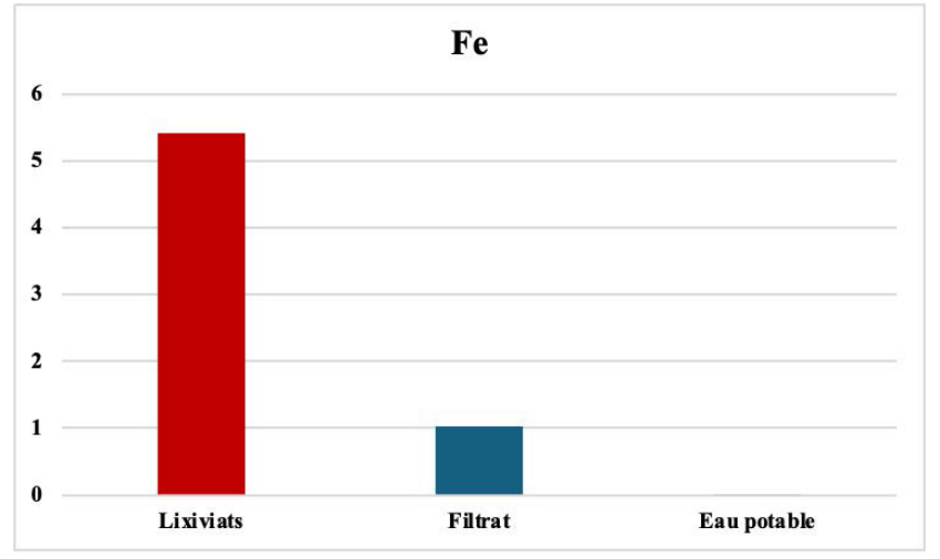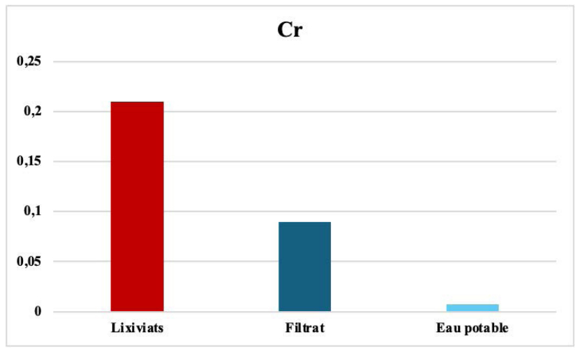Le chrome avant et après filtration. Le chrome est un métal lourd toxique qui peut causer des problèmes de santé graves, notamment des troubles du système respiratoire et des dommages aux organes. Le chrome présent dans les lixiviats en raison de diverses sources de pollution, à savoir les déchets industriels, tels que les déchets de l'industrie chimique et de l'industrie minière, des déchets ménagers, tels que les batteries et les produits de soins personnels, des systèmes de plomberie notamment les tuyaux et les robinets, et de l'industrie du cuir qui peut libérer du chrome dans les eaux usées en raison de l'utilisation de produits chimiques contenant du chrome. La teneur du chrome détectée dans les lixiviats a été réduite de 90 % par notre filtre, comme le montre clairement la figure 10. Cet abattement s'explique par des phénomènes de précipitation et d’adsorption qui jouent certainement un rôle d’atténuateur de la toxicité de cet élément [65-67].