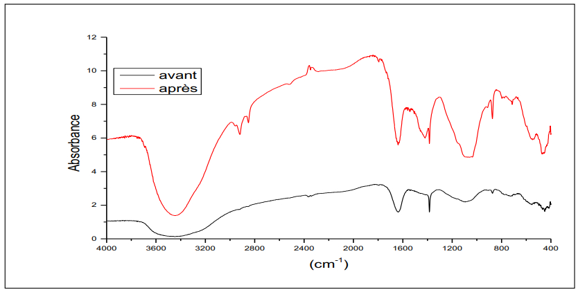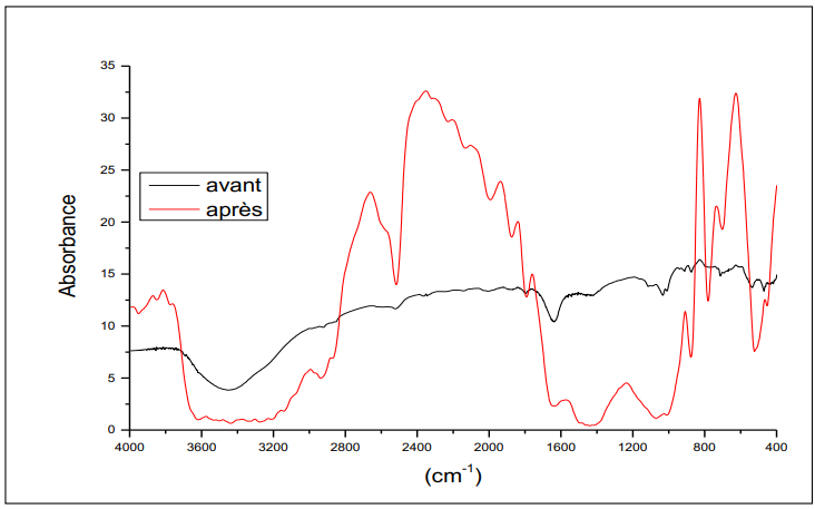 Le spectre infrarouge de l'échantillon du sable avant et après traitement (voir Figure 2), les deux dilués dans le KBr, montre la présence des bandes suivantes : une bande vers 3400 cm⁻¹ attribuée au groupement OH de l'eau, une bande faible vers 3100-2800 cm⁻¹ attribuée à des liaisons N-H dans les nitrates, fonction amine. On note la présence des bandes vers 2500-2300 cm⁻¹ attribuées aux vibrations des liaisons C-H des aromatiques.