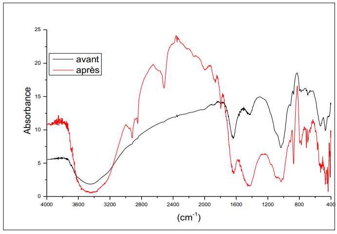 En comparant les spectres infrarouges des supports solides ayant servi à la filtration des eaux usées, on peut conclure qu’il y a une faible modification des spectres infrarouge avant et après traitement, ce qui confirme qu’il y a une adsorption de composés organiques.