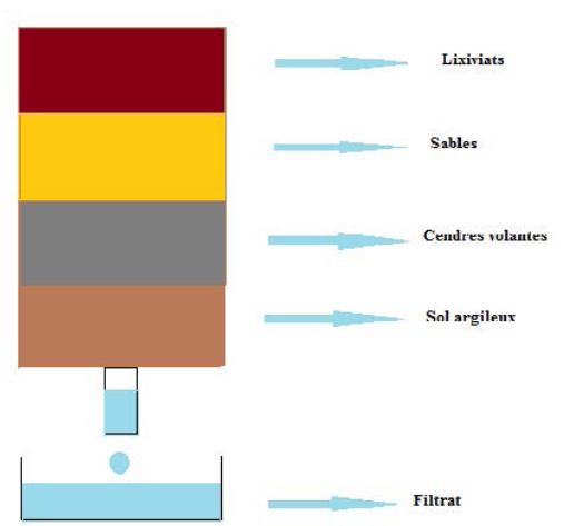Le montage expérimental utilisé est schématisé dans la figure 1. Il s'agit d'une colonne verticale de 10 cm de diamètre et de 100 cm de hauteur. Le lit filtrant est constitué dans l'ordre précis de sable marin, de cendres volantes et de sol agricole argileux. L'alimentation du système se fait exclusivement par des lixiviats des déchets ménagers et industriels.