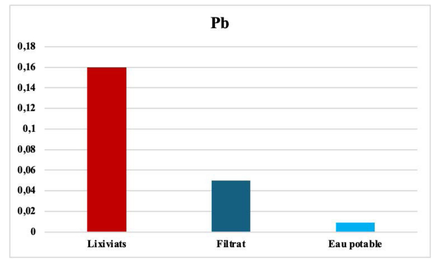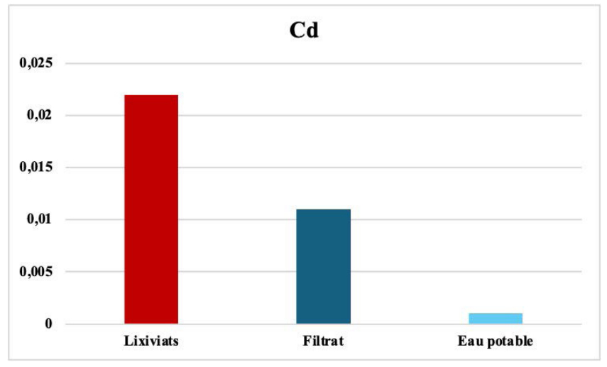 Le cadmium avant et après filtration. Le cadmium est un métal lourd qui peut causer des problèmes de santé graves, notamment des troubles du système rénal et des dommages aux os. Le taux de cadmium dans les lixiviats provient de la production de fertilisants non naturels à base de phosphate et aux rejets industriels liés à la métallurgie. Son traitement à travers le filtre utilisé a diminué la concentration du cadmium de 0,022 ppm à 0,011 ppm (voir Figure 5). Cet abattement est expliqué par l'immobilisation au niveau du substrat via des mécanismes tels que l'adsorption au niveau des sites d’échanges, la fixation à la matière organique, l'incorporation dans la structure du sol et par précipitation sous forme de composés insolubles [39-42].