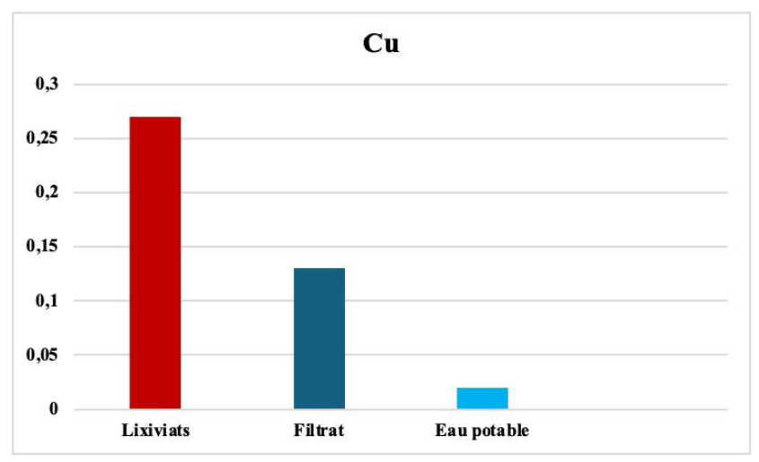 Le cuivre provient principalement des rejets industriels comme le traitement de surface, l'industrie chimique et électronique. Le dosage du cuivre dans l'eau percolée révèle une teneur de l'ordre de 0,02 ppm pour le filtrat récupéré, ce qui correspond au rendement épuratoire de 97 %.