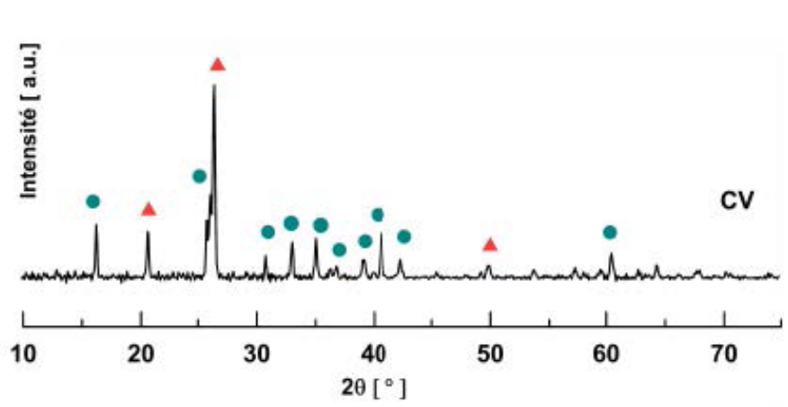 La composition minéralogique des cendres volantes est déterminée par diffraction des rayons X (voir Figure 4). Le spectre obtenu révèle l’existence de plusieurs raies qui sont identifiées au quartz et à la mullite. Un halo diffus est également observé sur le spectre et traduit la présence d’une phase amorphe. En tenant compte de l’histoire d’élaboration de ces cendres, il est possible d’expliquer cette minéralogie, en considérant la composition du charbon initial.