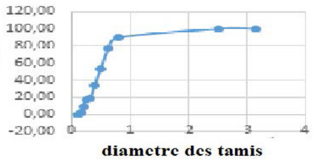 À l’issue d’une analyse granulométrique réalisée sur une colonne constituée de douze tamis empilés verticalement dans un ordre de maille décroissant de 2000 à 50 µm (méthode normalisée NF P 18-560), un échantillon de sable a été sélectionné parmi les échantillons prélevés. L’échantillon sélectionné se caractérise par une taille granulométrique de 100 µm (voir Figures 1 et 2). Des études réalisées dans notre laboratoire ont montré que plus la taille des échantillons de sable est fine, plus la vitesse d’infiltration diminue, ce qui améliore le temps de contact et le rendement épuratoire.