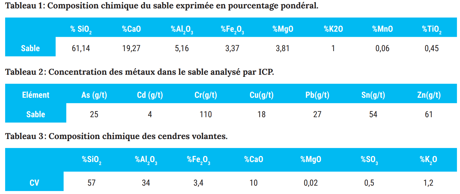 Le sable utilisé, de taille granulométrique bien choisie, provient de la plage de la ville d’El Jadida. Ce dernier a été nettoyé, lavé et séché dans une étuve à 40 °C, puis analysé par diffraction X pour déterminer précisément la teneur en calcite et en silice, et finalement par spectroscopie ICP (Inductively Coupled Plasma) pour s’assurer de l’absence de traces de métaux lourds.