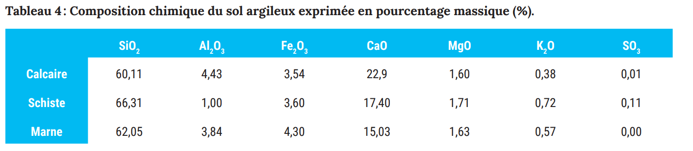 Tableau 4 : Composition chimique du sol argileux exprimée en pourcentage massique (%).