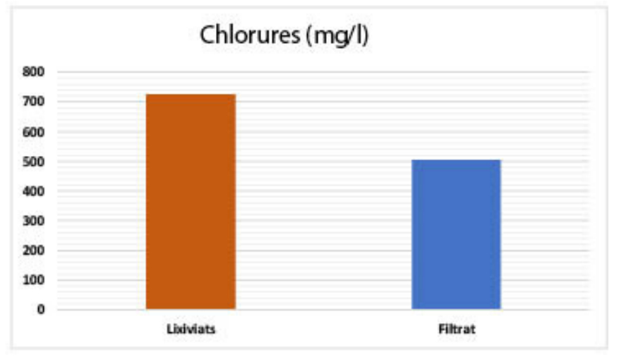 Les rejets étudiés sont également trop chargés en ions chlorures avec des valeurs dépassant les 700 mg l-1. L’élimination des anions chlorures (voir Figure 10) peut être expliquée par la présence des cations contenus dans les différents supports filtrants utilisés et qui piègent ces ions par adsorption ou par échange d’ions. C’est le cas des cendres volantes qui sont connues comme des matériaux naturels présentant une bonne capacité d'échanges d’ions et un pouvoir d’adsorption et d’élimination de plusieurs polluants de l’eau.
