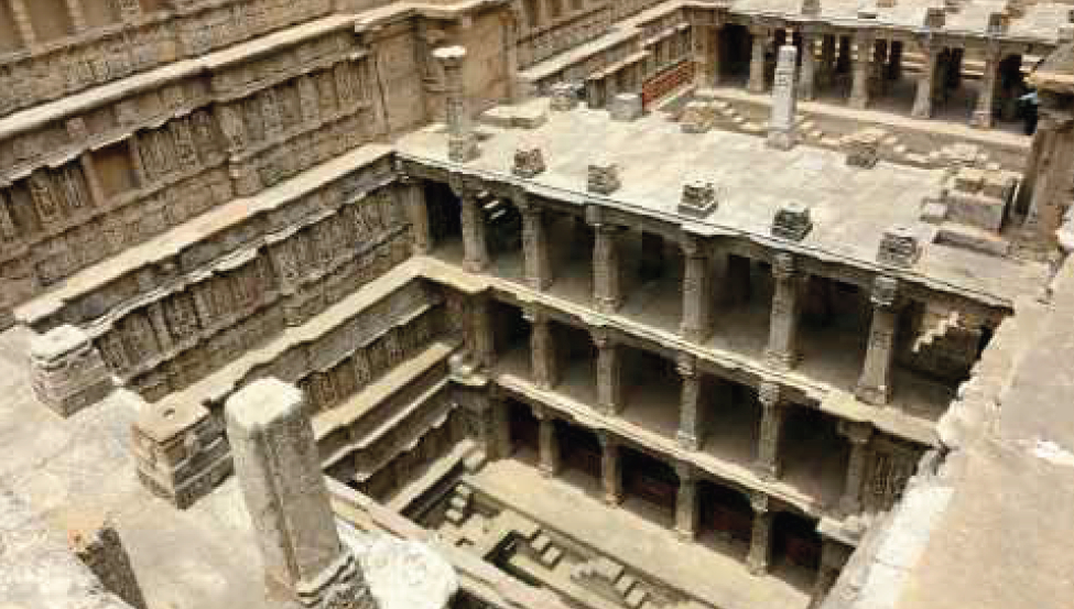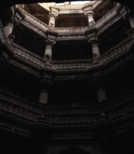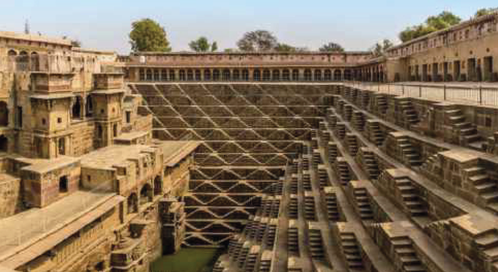 À la différence d'un simple puits cylindrique, le stepwell s'étale en plan autour du puits central, formant un vaste entonnoir inversé. D’étroites marches de pierre descendent en paliers réguliers le long des parois, assurant un accès progressif à l'eau en fonction de son niveau : lorsque le puits est plein.